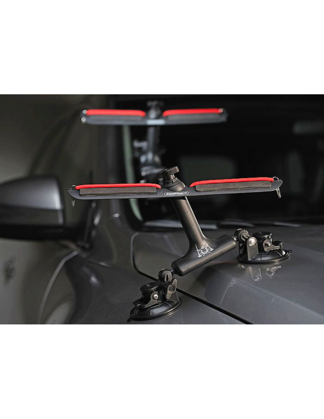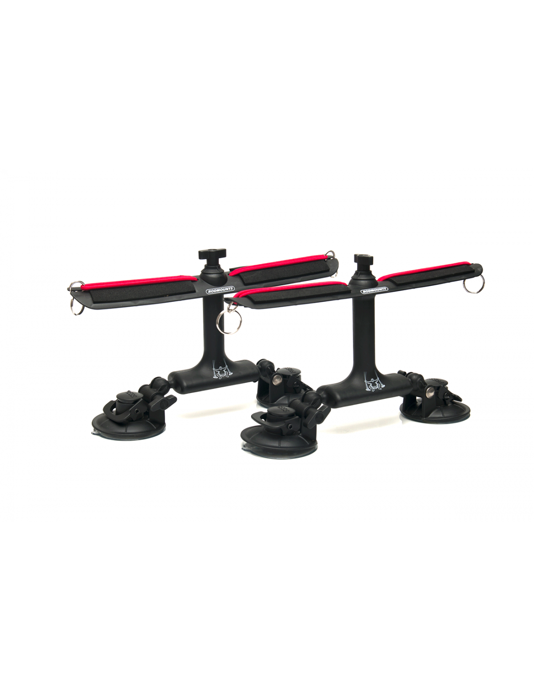 Four independent lever-lock suction mounts adhere to glass, aluminum, steel, plastic, fiberglass and carbon-fiber.