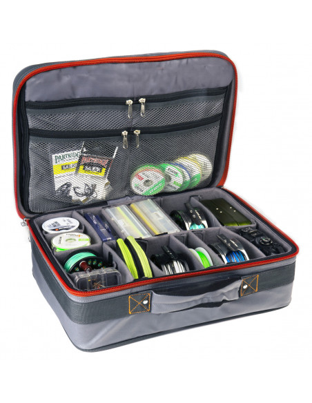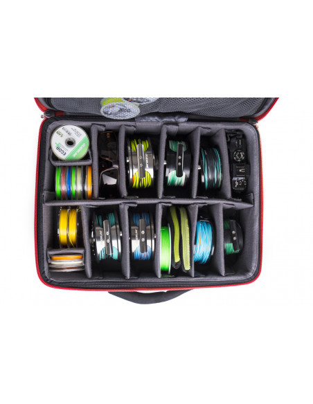 It's ideal for carrying all your spare reels and spools and accessories that you don't take to the water's edge but are happy to have in the car or at the fishing camp to deal with an unforeseen situation (flooding, loss of a reel) and to save a fishing trip that goes awry (repairing a waders, changing laces, fishing strategy, etc.)