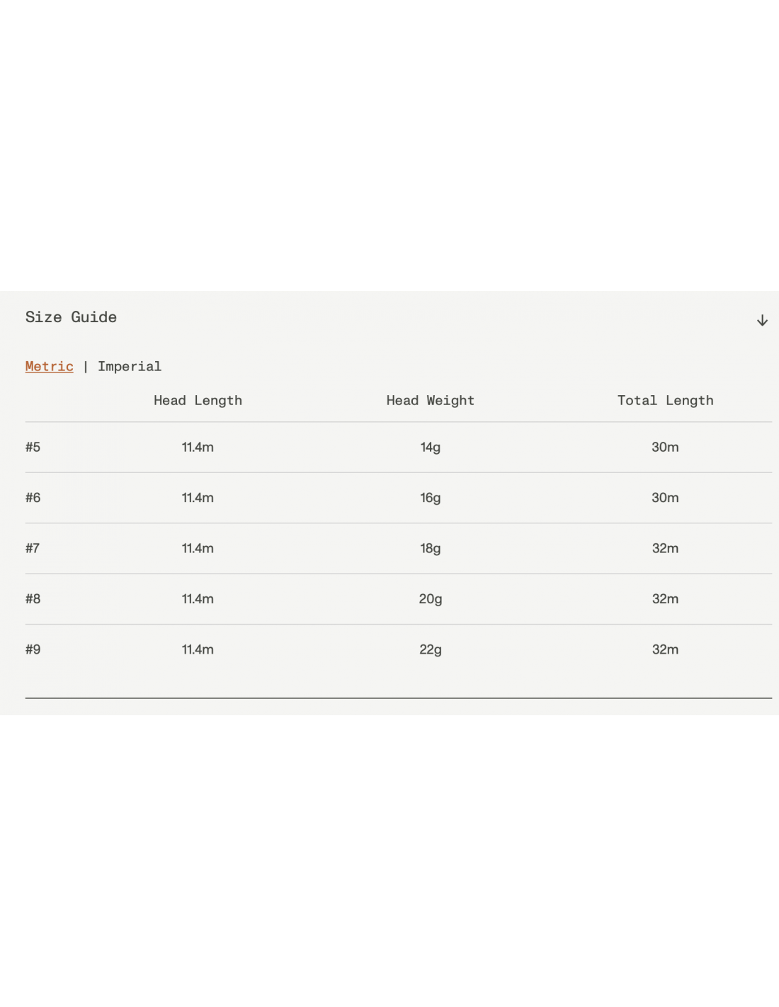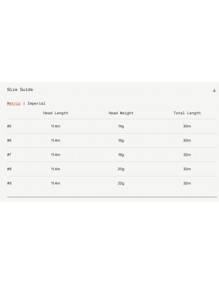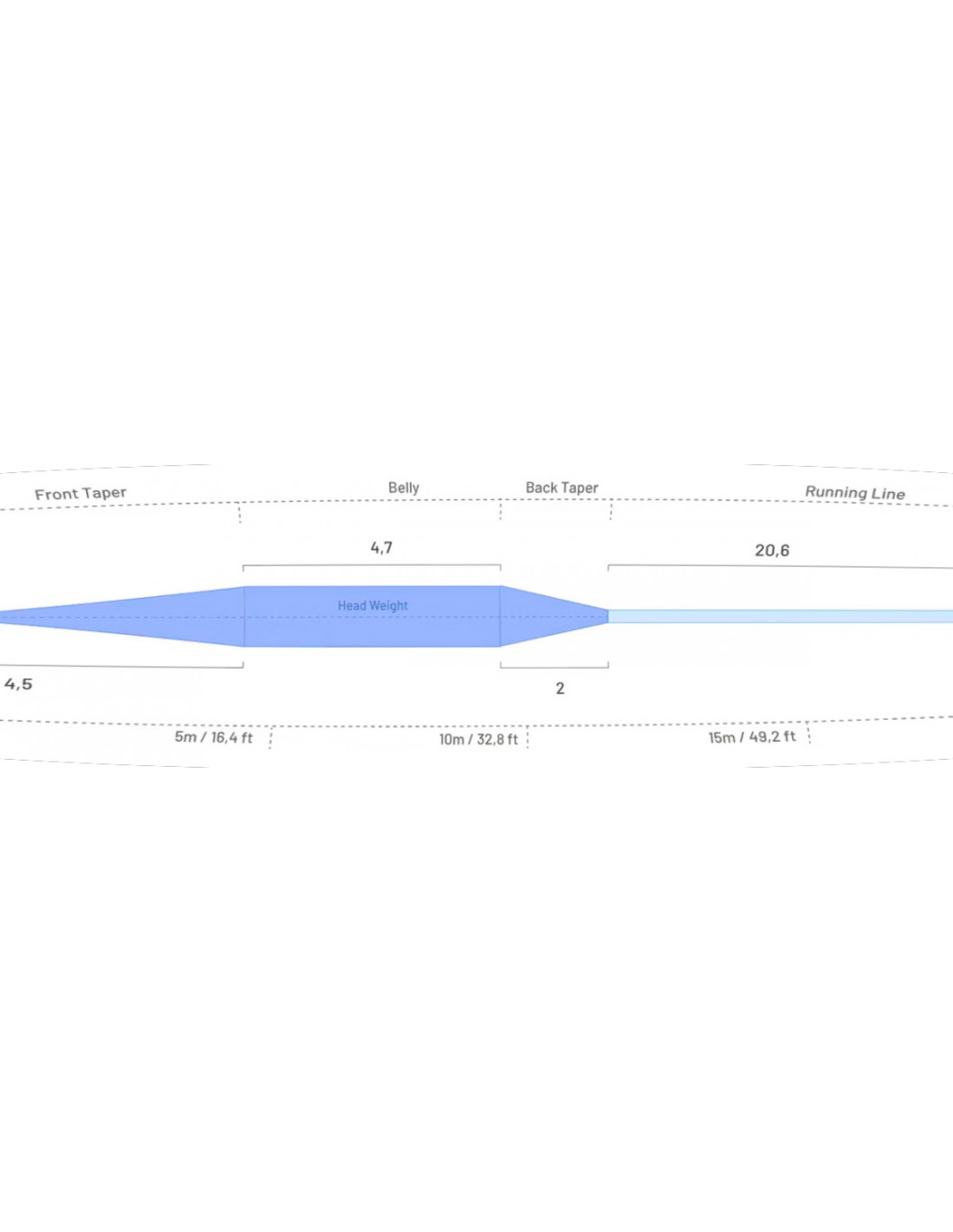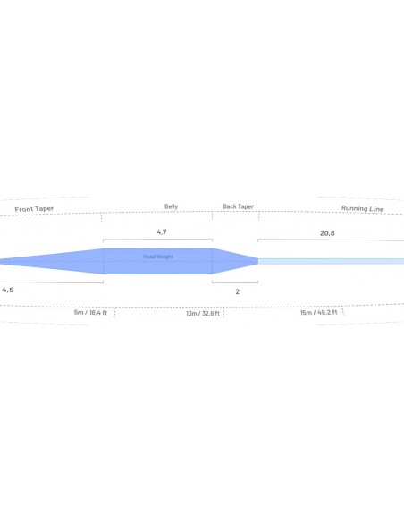 The total head length of 11.4 meters includes a back taper of 2 m / 6.5 ft, allowing you to carry a good amount of line in the air for long casts or quickly deliver a cast with the back taper still inside the rod tip.