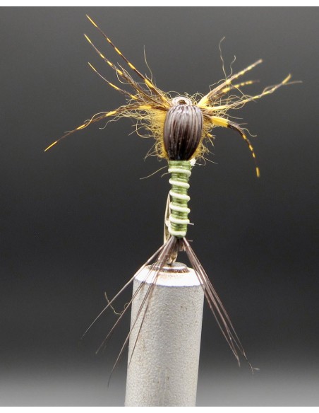 The Florian Dark Olive surface nymph NS OF is a very light nymph pattern, particularly effective during hatches of small dark olive mayflies, when nymphs drift on the surface before undergoing metamorphosis.