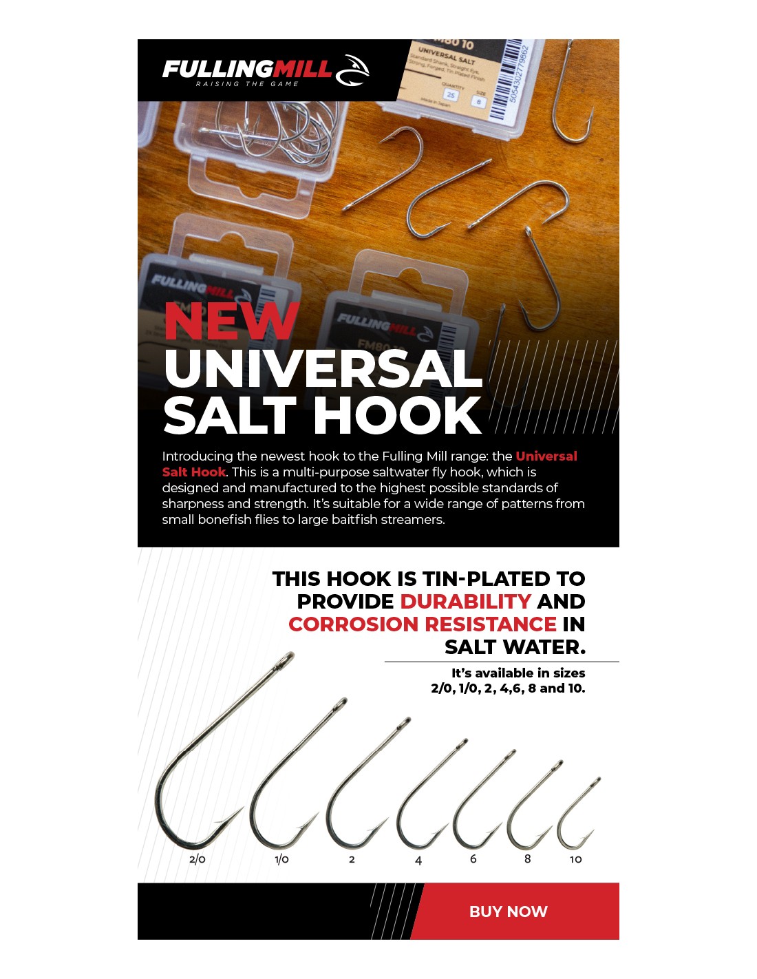 Fulling Mill Universal Salt Saltwater Fly Hooks are suitable for a wide range of uses from bonefish patterns and crabs, to clousers, other baitfish patterns and everything in between.