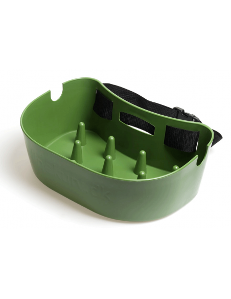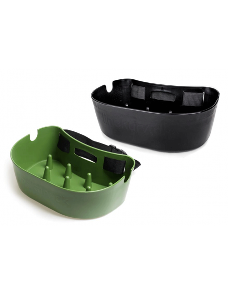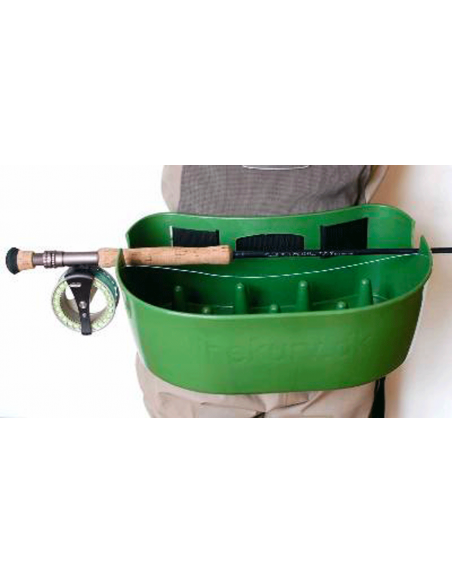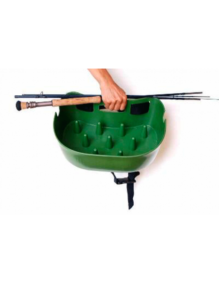 The Linekurv shooting basket comes with a belt, either classic or elastic, and has some useful features: A carrying handle, a curved shape for comfort and ergonomics (the basket follows the curves of the body) and an integrated rod holder, very practical for keeping your hands free when releasing a fish.