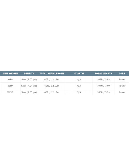 Cette ligne de pêche à la mouche Cold Saltwater Striper démontre une importante vitesse d’immersion de 17,78 cm/seconde (7ips).
