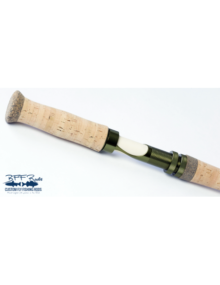 Porte-moulinet : Bloke Switch/Spey à vissage vers le bas en aluminium anodisé finition vert bronze avec insert en polymère ivoire.