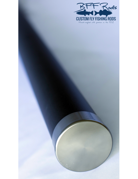 Conditionnement : tube aluminium HD (Heavy Duty) finition noire laquée + bouchon aluminium finition gunmetal (97 cm) + étui compartimenté tissu polyester Burlington bleu marine avec lacets de serrage haut et bas (fabriqué en Bretagne à Morlaix)