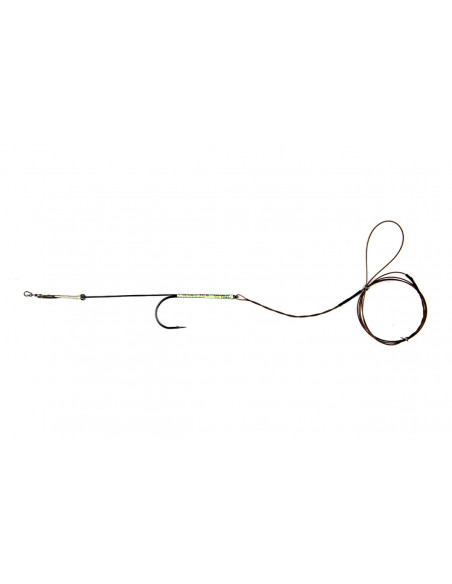Ce montage est composé d'un bas de ligne en acier gainé nylon de 26lb 49 brins avec des boucles thermosoudées, d'un hameçon brochet 4/0 super résistant et d'un hameçon “stinger” (hameçon chance) 2/0 avec un fil de titane simple très fin et pour finir un avançon d’attache à agrafe pour wiggle tail.